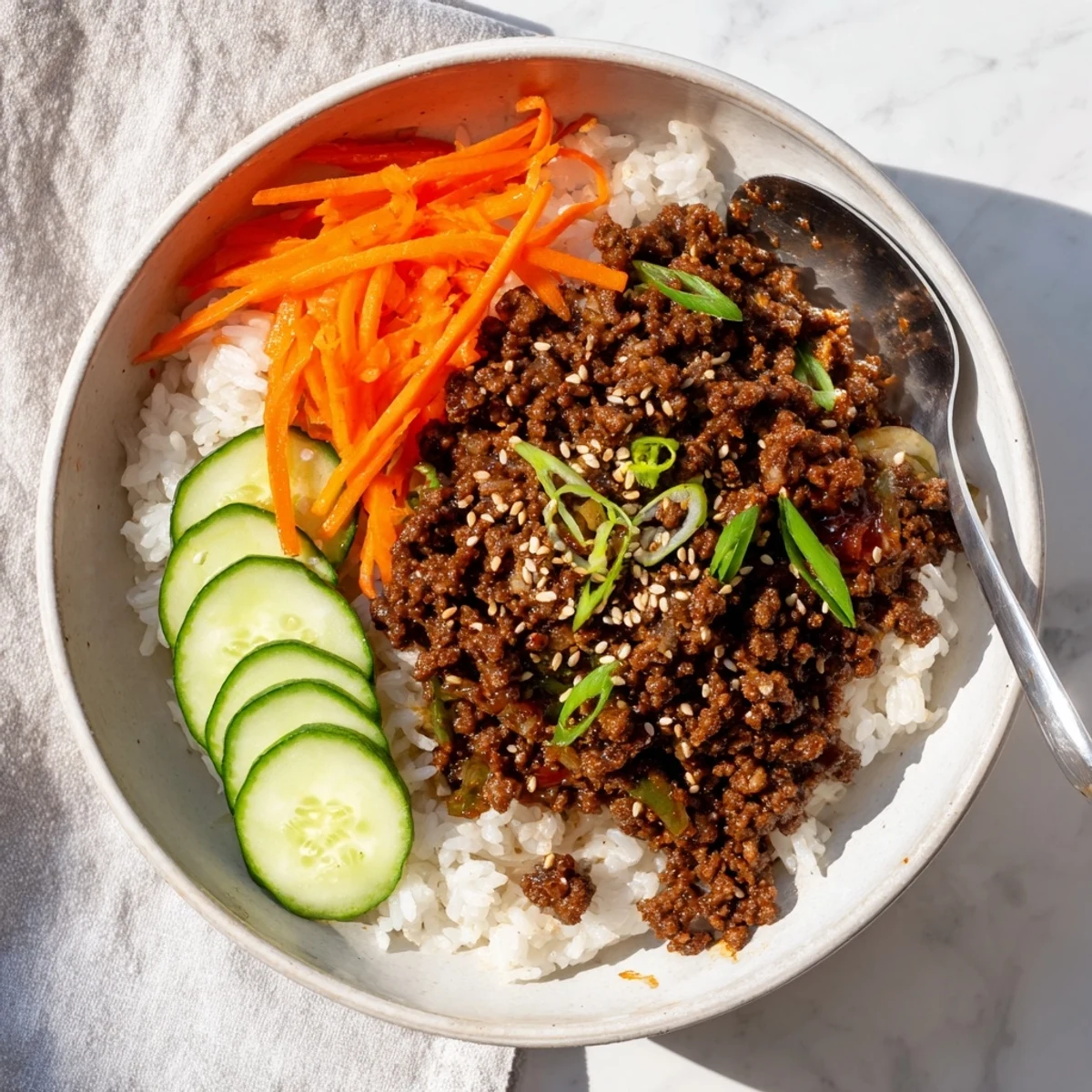 These Korean-inspired bowls feature seasoned ground beef cooked in a tangy-sweet sauce with garlic, ginger, and gochujang. Served over fluffy jasmine rice with crisp carrots, cucumber, and scallions, this dish comes together in just 25 minutes for a satisfying weeknight meal. The sauce balances savory soy sauce with brown sugar and sesame oil, while optional kimchi adds authentic Korean flair.