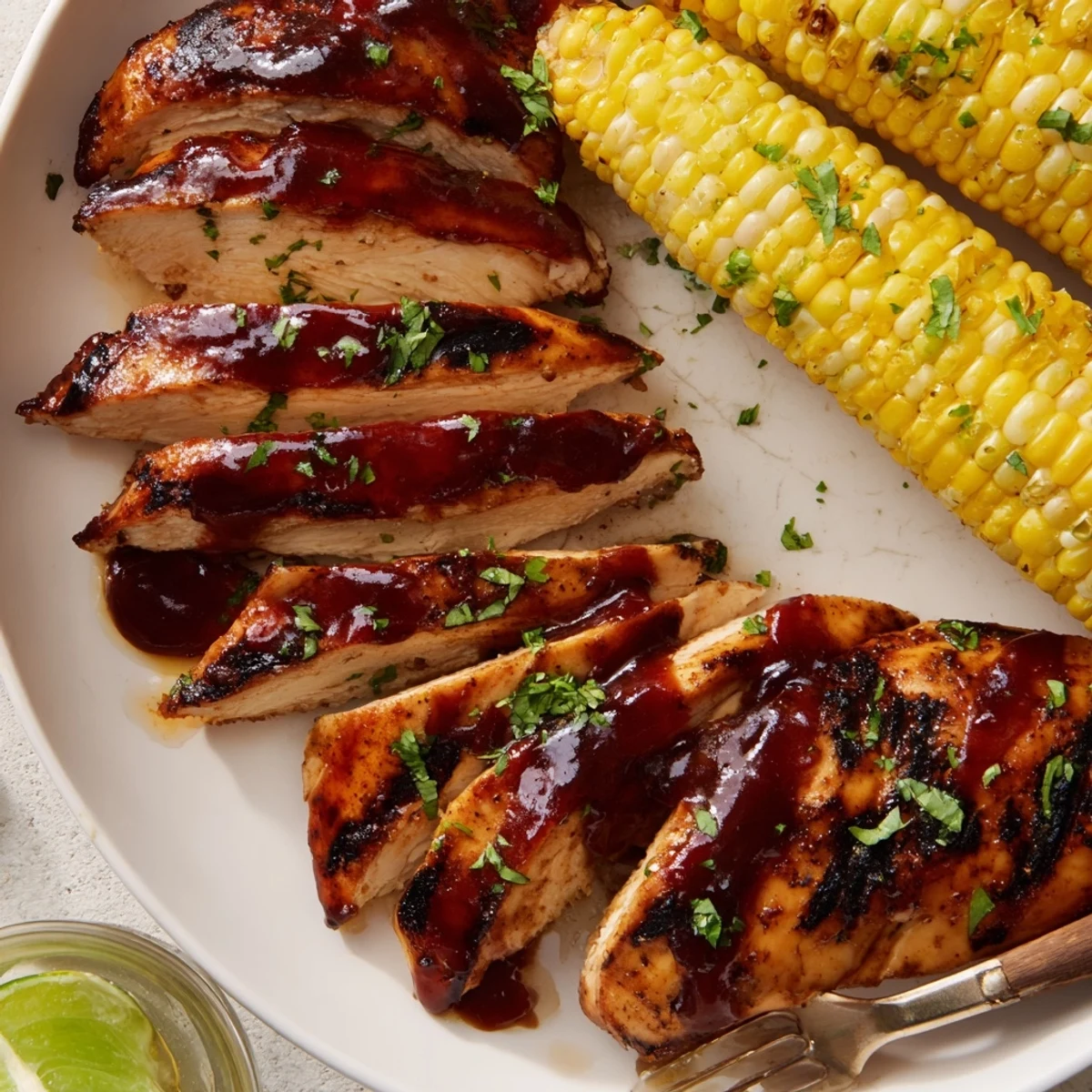 Fire up a medium-high grill and season boneless chicken breasts with olive oil, smoked paprika, garlic and onion powders, salt and pepper. Grill 6–7 minutes per side, basting with barbecue sauce during the last minutes until internal temp reaches 74°C/165°F. Turn corn brushed with butter until tender and charred, about 10–12 minutes. Let chicken rest 5 minutes before slicing; garnish with parsley and lime. Serve with potato salad or coleslaw for a complete summer meal.