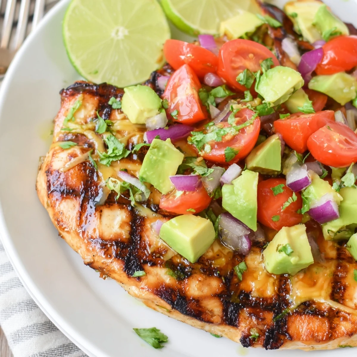 This zesty lime-marinated chicken is quick to prep and ideal for grilling: whisk lime juice, oil, garlic, honey and spices, marinate the breasts for at least 15 minutes (up to 2 hours), then grill 6–8 minutes per side until cooked through. Top with diced avocado, cherry tomatoes, red onion and cilantro; add cheese in the last minutes to melt. Serves 4 and pairs well with rice, tortillas or a crisp salad.