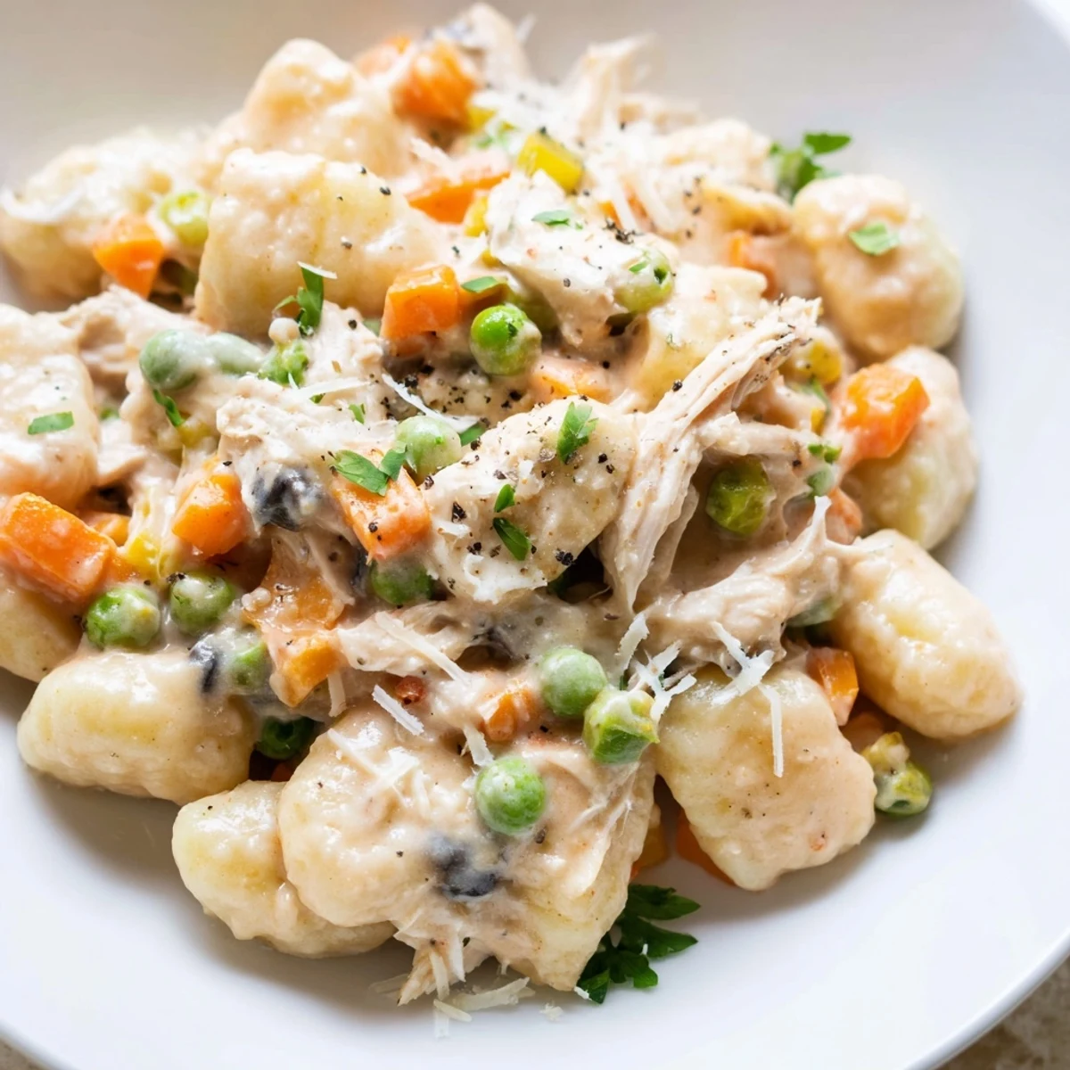 - Gently fold in gnocchi, chicken, and peas until everything is submerged