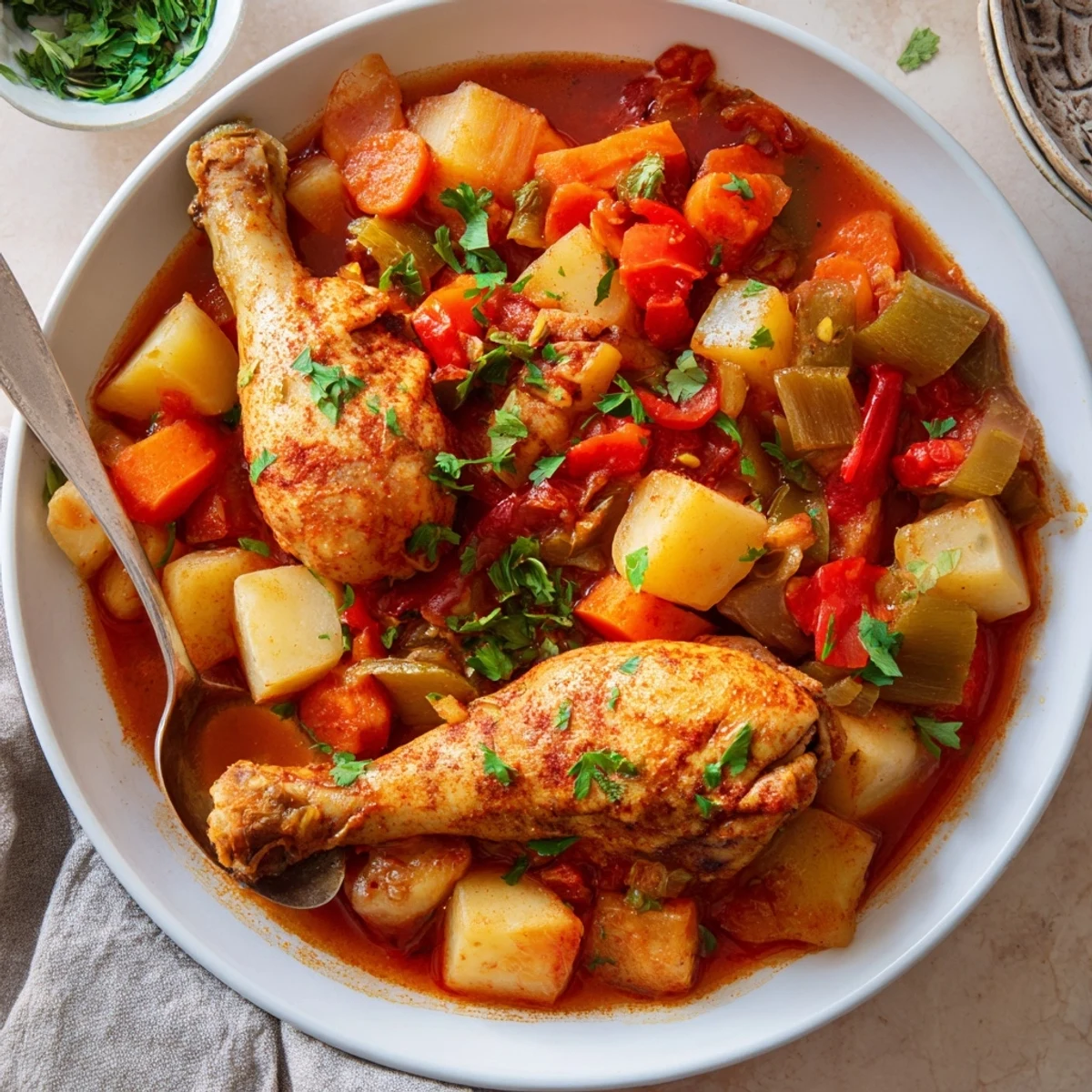 This hearty Spanish stew features tender chicken drumsticks slowly simmered in a fragrant tomato and smoked paprika base. The sauce absorbs deep flavors from sautéed onions, bell peppers, garlic, and aromatic herbs like thyme and oregano. Carrots and potatoes add substance while creating a velvety texture.